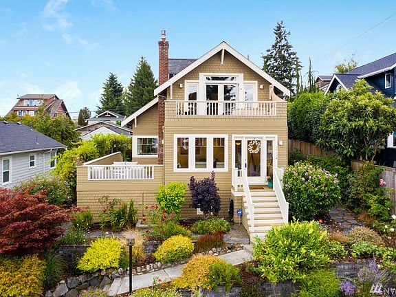 Perched above the street for maximum sunlight and Majestic Sound and Mountain views. This light filled entertaining home brings tons of year round enjoyment.The formal living room has views of the sound and mountains. The cooks kitchen boasts Wolf gas stove, SS appls, and entertaining view deck. 2 beds on the main and 2 up, 2 tiled baths.The spacious Master suite features vaulted ceilings, walk in closet, a private view deck with hot tub. Rare 2 car garage off alley/plans for a dadu, 3rd parking