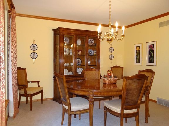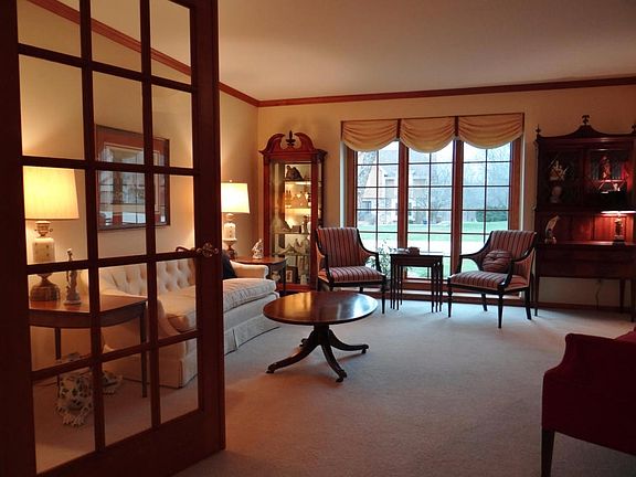Quiet River Meadows cul-de-sac! This quality built home features six panel doors, vaulted ceilings, skylights and pretty built-ins. Two story foyer, formal living and dining rooms. French doors to charming open concept family rm with custom designed brick fireplace, gorgeous tall windows and oak cornices. Lots of wood cabinets, Earthstone counters, built in desk and dinette. Three big bedrooms includes a master suite, cathedral ceiling and library. Finished lower level with wet bar. Extra bedroom with full bath.