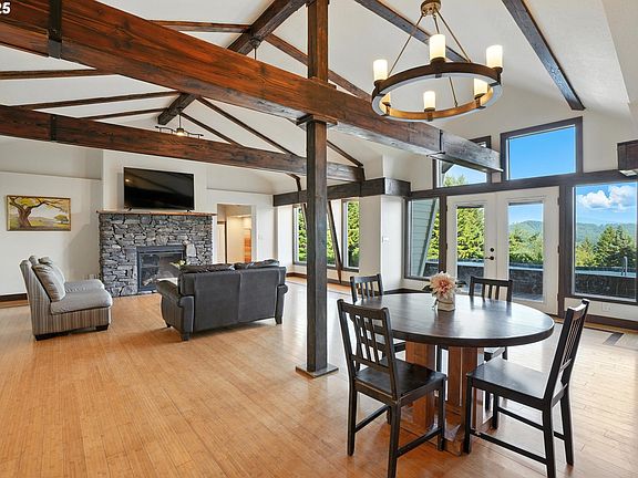 This beautifully updated mountain chalet-farmhouse on 6.5 private acres in Camas, Washington offers breathtaking views of Mt. Hood, Mt. Jefferson, and the Columbia River Gorge. Surrounded by old-growth trees, meadows, and mature apple, cherry, and plum trees plus blueberry bushes, this serene property is designed for both luxury and functionality. It features a private drive, RV and boat storage, a 1,200 sq ft detached shop, and an attached five-car tandem garage. The home offers main-level living with a multigenerational layout and was thoughtfully designed for separate living quarters or ADU potential with two laundry hookups. Inside, enjoy a spacious primary suite with a large walk-in closet, jetted tub, and multi-head shower, along with high ceilings, exposed beams, and bamboo flooring with an inlay border. The open gourmet kitchen includes a gas range, and the home offers two living rooms, five bedrooms, and three bathrooms. A loft with a full bath and private deck is perfect for a home office or guest suite, while the expansive front deck is ideal for entertaining and taking in the panoramic views. Conveniently located just minutes from Downtown Camas restaurants, shops, and art galleries, seven miles to Camas High School, five miles to Grove Field Airport, and only 35 minutes to PDX, this rare property offers a harmonious blend of nature, privacy, and modern comfort. Open house this weekend, Saturday and Sunday from 1–4 pm.