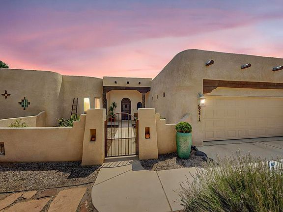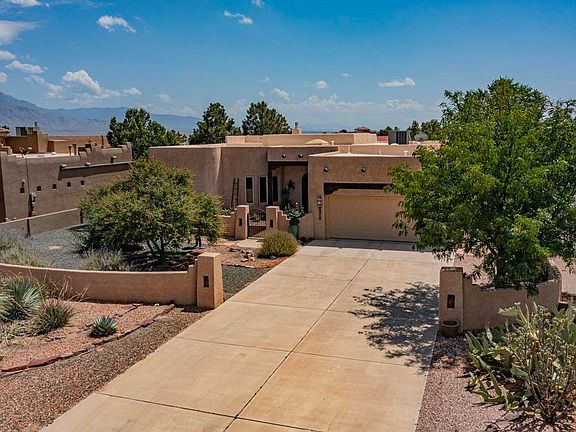 EXCEPTIONAL Custom Southwest style home in the desirable neighborhood of Vista Entrada. This exquisite property boasts a brilliantly designed interior with Viga beam ceilings, Hickory flooring, custom shelving in the open-concept living room.The spacious kitchen features a cafe island, gleaming granite countertops, custom cabinetry, a separate range, all perfect for gourmet cooking & entertaining where all can enjoy the vibrant New Mexican skies from the elegant semi-circular dining area. The single-level home includes a luxurious primary bedroom with 2 walk-in closets, dual vanities, a snail shower, a garden tub, plus two guest rooms and versatile flex room. Additional highlights, beautiful Xeriscaped front & backyard featuring a spacious, lofty, private, flagstone Patio for relaxing