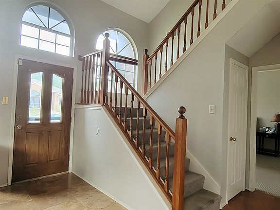 Don't wait any longer fresh new designer wall paint in the works come take a look!  This beautiful two-story home offers an impressive entrance with vaulted ceilings, leading into an open-concept family room and dining area bathed in natural light plus a powder bath for the guest. The updated kitchen features granite countertops, ample counter space, and a breakfast area, perfect for casual meals. Enjoy your mornings or evenings on the covered patio overlooking the backyard, ideal for relaxing with a cup of coffee. The master suite is conveniently located downstairs, offering a private retreat with a separate tub and shower and a double vanity. Upstairs, a spacious game room provides a fantastic secondary living area for kids and their friends to gather. Both secondary bedrooms upstairs boast generous walk-in closets.. This home's location is a key highlight, being within walking or biking distance to the 117-acre Lakes of Springfield Park. The park features walking or biking trails, picnic pavilions, a playground, restrooms, and other amenities for outdoor enjoyment. Reviews from Yelp and Wheree describe the park as family-friendly with a large shaded playground, pond, and walking trails.  The property is also conveniently located near Lake Ray Hubbard, major highways, Fire wheel Mall, and various restaurants, making it a truly desirable place to call home.