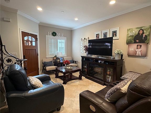 Step into an inviting open-concept living area adorned with travertine flooring, elegant crown molding, and soft LED recessed lighting that creates a serene ambiance throughout. The gourmet kitchen is a showpiece — featuring quartz countertops, high-end Samsung stainless steel appliances, and under-cabinet lighting that enhances both function and style.