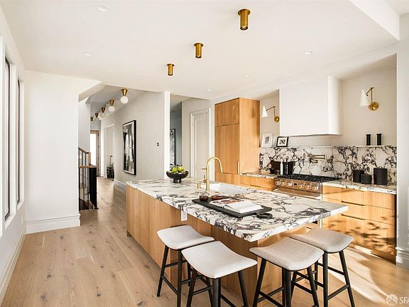 Just around the corner from Golden Gate Park and Rossi Pool, this down-to-the-studs remodeled masterpiece combines Victorian charm with the modern family's needs. On the main level Calacatta Viola marble countertops adorn custom white oak cabinetry and high-end appliances from Bosch and Fisher & Paykel. An east-facing family room with built-in entertainment wall opens onto a spacious deck with a plumbed gas line. Towards the front of the home, a formal dining/living, guest suite, and powder room round out this floor. The white oak capped, custom-welded handrail precisely frames the stairs that traverse all 3 levels. On top is an entertainer's heaven including a lounge, bedroom, full bath, and exterior deck. South and East facing windows and skylights beam natural light throughout the home. The lower level is built for family life with a laundry room, storage closets, and 3 en-suite bedrooms whose bathrooms provide locally heated floors. Custom glass shower enclosures, designer tiling, and beautiful light fixtures round out the luxurious offering's interior. An EV-ready plug is in the garage, an electronically locked Delivery Closet enables secured package receipt even when you may be frequenting Coffee Movement, Arguello Market, Arsicault or any other of the area's attractions.