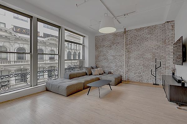 This stylish, tranquil 1,511 square foot, cast-iron NoHo loft literally steps away from the uber-cool Bond Street features soaring 12-foot ceilings, an expansive 26-foot-wide living room with massive floor-to-ceiling windows, whitewashed exposed brick, custom whitewashed hardwood floors, two full bathrooms, and abundant storage. Sitting proudly at the crossroads of SoHo, West Village and East Village, this hip sanctuary is impeccably furnished and designed with an oversized custom Saba sectional couch handmade in Italy, a sleek black oak dining table with six black velvet chairs, two striking 6-foot collectable abstract paintings, two large flatscreen TVs, two impressive oversized bronze mirrors, and a kitchen with custom white cabinetry, a SubZero fridge, a double-stacked dishwasher, and a recently serviced HVAC system. Past the kitchen lies a serene lounge which can serve as a second bedroom with its own full bathroom, an oversized window, and a large closet furnished in peaceful ivory hues featuring a loveseat, boucle lounge chair, a custom 7.5-foot mirror handmade by Sovet Italia, all grounded by a rose marble plinth from Calacatta Viola, one of Italy's oldest quarries. At the back of the apartment sits the master bedroom, tucked away for maximum privacy and relaxation, featuring a king bed, a second full bathroom, an oversized window, and a large walk-in closet with custom shelving. This intimate 12-story building only has 17 apartments, two elevators, and a beautifully landscaped roof deck with two barbeques and sitting areas. Three major subway lines are only a 2 to 3 minute walk away 4/5/6 (green), B/D/F/M (orange), and N/Q/R (yellow). Respectful, courteous applicants only, please. Easy approval process for qualified tenants. Pets allowed with approval. Virtual video tour available upon request. Note - scaffolding in third picture has been fully taken down.