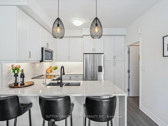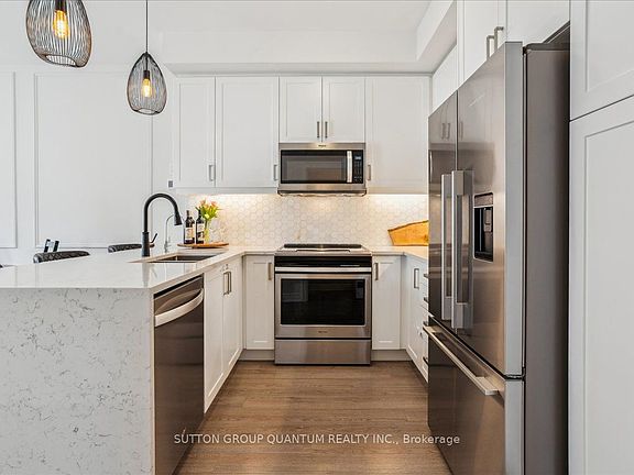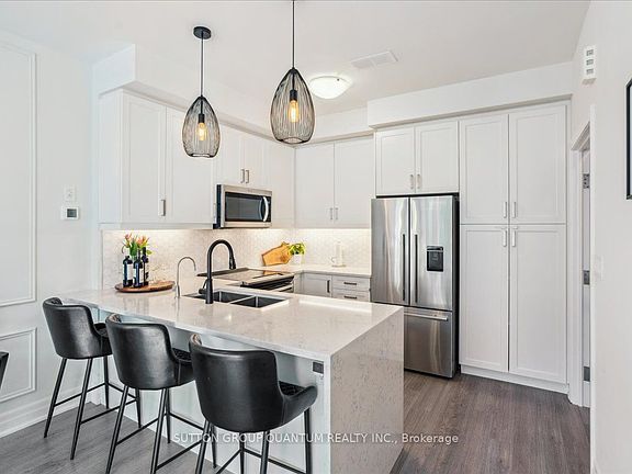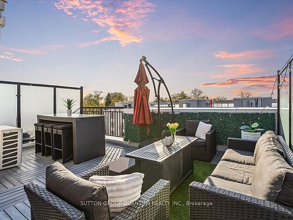 Welcome to 220-652 Cricklewood Drive, a stunning luxury stacked townhome nestled in one of Mississaugas most sought-after neighborhoods, Mineola. This elegant 2-bedroom, 2-bathroom residence offers the perfect blend of upscale finishes, functional space, and sophisticated design. Step inside and be greeted by tall ceilings and refined wainscoting, adding a touch of timeless elegance to the modern interior. The open-concept layout features upgraded appliances, a striking quartz waterfall countertop, custom backsplash, and sleek cabinetry ideal for both everyday living and entertaining. Enjoy a private balcony off the main living area and unwind or host on your expansive rooftop terrace (patio furniture is negotiable), perfect for summer evenings under the stars. The primary bedroom is generously sized, filled with natural light, comfortably fits a king-sized bed, and includes a private ensuite bathroom for your convenience and comfort. The second bedroom offers flexibility for guests, a home office, or a growing family. Set within a vibrant, family-oriented community, this home is close to top-rated schools, parks, local shops, and the scenic waterfront trails of Port Credit. With easy access to the QEW, GO Train, and public transit, commuting across the GTA is simple and efficient.Whether you're a professional couple, a young family, or someone seeking stylish, low-maintenance living, this home delivers on every level. Experience the unmatched charm and convenience of Mineola living where tranquility meets urban accessibility.