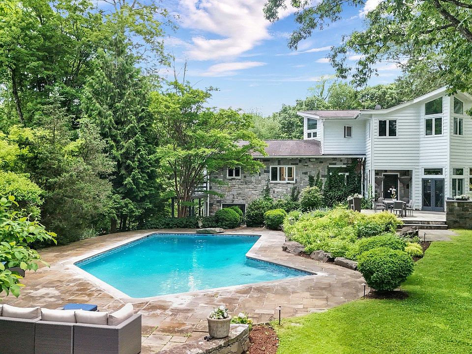 Tucked away on 2 private, beautifully landscaped acres in the sought-after Briarcliff Manor school district, this exceptional mid-century modern retreat offers the perfect blend of design, comfort, and functionality. The property boasts a resurfaced saltwater pool, perennial gardens, a tranquil koi pond, and a sprawling backyard with space for a potential tennis court. Step inside the sun-drenched main house, where floor-to-ceiling windows, soaring ceilings, and an open layout create a bright and welcoming atmosphere. The oversized living room is ideal for entertaining year-round—gather by the fireplace in winter, or open the sliding doors to a wraparound deck perfect for summer celebrations. At the heart of the home is a designer kitchen featured in Architectural Digest, showcasing a bold black-and-white aesthetic, an oversized quartz island, top-of-the-line Wolf and Sub-Zero appliances, abundant storage, and direct access to the poolside patio. Adjacent spaces include a cozy family room with a wood-burning fireplace, a library, a summer bar, a butler’s pantry, mudroom, and a newly renovated powder room. The primary suite is just a few steps up and features vaulted ceilings, floor-to-ceiling windows, a massive walk-in closet, and a 2023-renovated spa bath with a double vanity, rain shower, and soaking tub. The second floor includes four generously sized bedrooms, each fitting a queen or king-sized bed, and two updated hall bathrooms. The walk-out lower level offers incredible versatility with a playroom, additional bedroom or office, full bath, gym, laundry room, utilities, and direct access to the pool area. A detached garage with a spacious loft apartment provides flexible options for a home office, studio, or guest suite and includes a full bath. In addition, the garage has been finished with an epoxy floor and electric charger. Half the garage is currently used as a full gym and is heated. In addition to many other fabulous upgrades, the property includes an enterprise-grade internet system installed in 2018, which covers the house, garage, and pool area with top-of-the-line Wi-Fi. All just 4 minutes to Scarborough train station (46 min to New York City) or 13 minutes to Tarrytown (express train: 37 min). This is luxury suburban living with the best of both worlds—privacy, space, and unbeatable convenience!