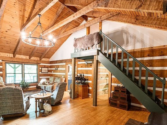 Stocked pondGorgeous log homeWrap around porchWood burning stoveNew windowsHuge renovated kitchenHardwood and tile floors