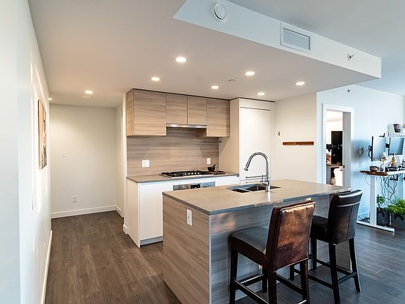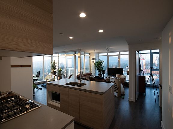 Enjoy an open-concept kitchen equipped with high-end stainless steel appliances, a Bosch gas cooktop, and sleek modern finishes perfect for everyday living and entertaining. Floor-to-ceiling windows provide breathtaking panoramic views of the city skyline and surrounding mountains.