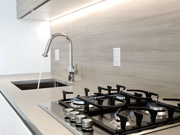 * Bosch kitchen appliances including natural gas cooktop, convection wall oven, integrated fridge and dishwasher, in-suite washer and dryer, discreet and stylish roller shades throughout, premium soft-close kitchen cabinets and drawers and euro-inspired designer composite stone countertops.