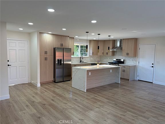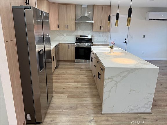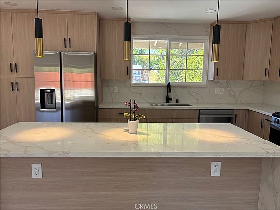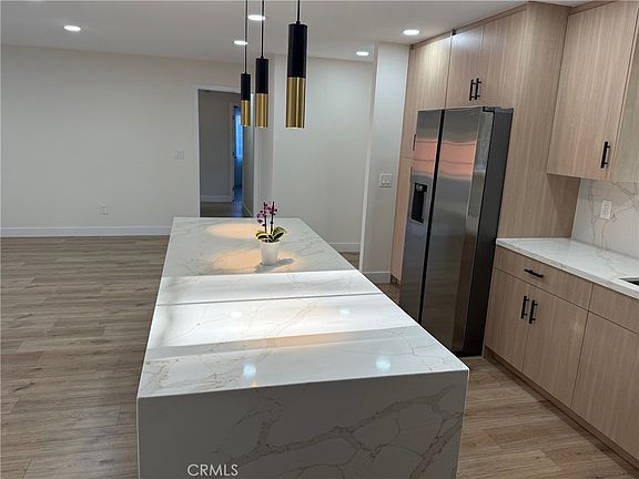This light and bright residence offers a spacious living room filled with natural light and an airy ambiance. The beautifully remodeled kitchen is a chef's dream, featuring quartz countertops, a functional center island, brand-new stainless-steel appliances including a new refrigerator, and custom-made cabinetry.