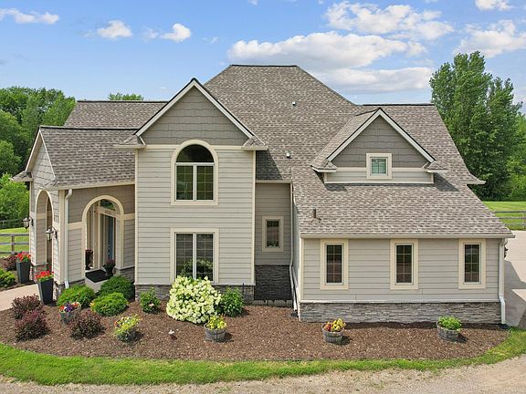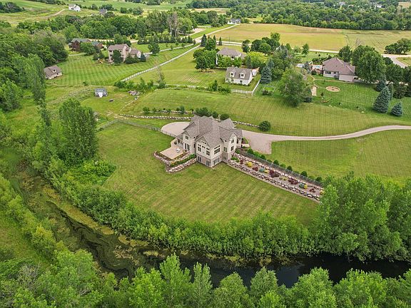 This stunning, one-of-a-kind home is nestled on 10 acres of breathtaking beauty and tranquility. The property features a stone patio overlooking the fenced backyard, beautiful landscaping, fruit trees and wildlife-filled pond with a walking path. Inside, you'll be captivated by the open spaces and two-story great room with stone fireplace. Numerous windows provide abundant natural light from all directions. The gourmet chef's kitchen with 10-foot island and Viking appliances is perfect for family gatherings and entertaining. Every surface has been updated, reflecting the character and care invested in every room. The newly finished basement offers ample recreation space including a built-in playroom. Additional features include custom concrete in-floor heating, large closets with organized storage, a 700 sq. ft. storage/exercise room, Kinetico water system, and heated, insulated garage. Bring your toys and enjoy this private slice of the country, just minutes from downtown!