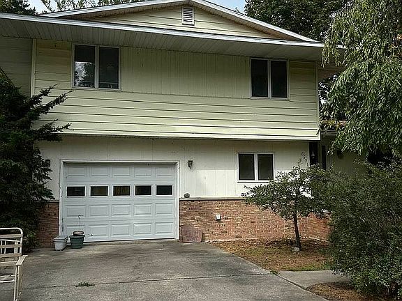Two-story exterior with brick and siding, attached garage, and spacious driveway