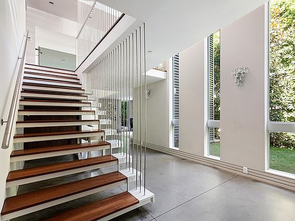 Featured in DWELL Home Collections and WSJ is an architectural dream. Enter the home and you cannot help but notice the floating staircase, the open floor plan concept, soaring walls, and floor to ceiling windows bringing in beautiful natural light. It is perfect for family and entertaining. The main level seamlessly combines the kitchen, formal living room and dining room. Then open the accordion doors to the grassy backyard, pool and outdoor dining area. The home features 4 bedrooms and 3.5 bathrooms. The main bedroom is its own private suite with two walk in closets and a private balcony. The home is also a smart home, built with sustainable materials and interchangeable exterior pieces. This modern architectural home is timeless and unique.