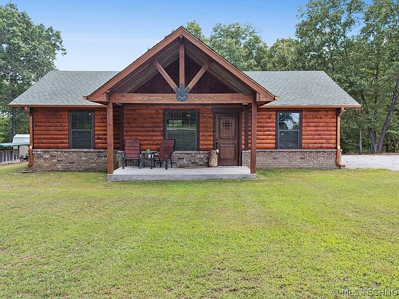 Daily Retreat! Come seclude yourself in this custom built log home tucked at the end of a long winding drive on 10 acres of hardwoods in the Foothills of the Ozarks. This tranquil sanctuary features 3 bedrooms, 2 baths, and spans 1380 sq. ft. of thoughtfully crafted living space. Constructed with 2x6 walls and blown-in insulation, enjoy year-round comfort and energy efficiency. As you step inside, a warm ambiance greets you with a cozy gas fireplace and inviting living areas adorned with hand-cut walnut trim and exquisite details throughout. The heart of the home boasts a live-edge walnut kitchen island handcut from the property, blending rustic charm with modern convenience. Relaxation awaits on the covered front porch, offering unobstructed panoramic country views. Whether you seek solace in nature or a place to escape, this property promises a perfect blend of tranquility and comfort. Schedule your private tour today and envision yourself living amidst the beauty and serenity of this unique rural retreat.