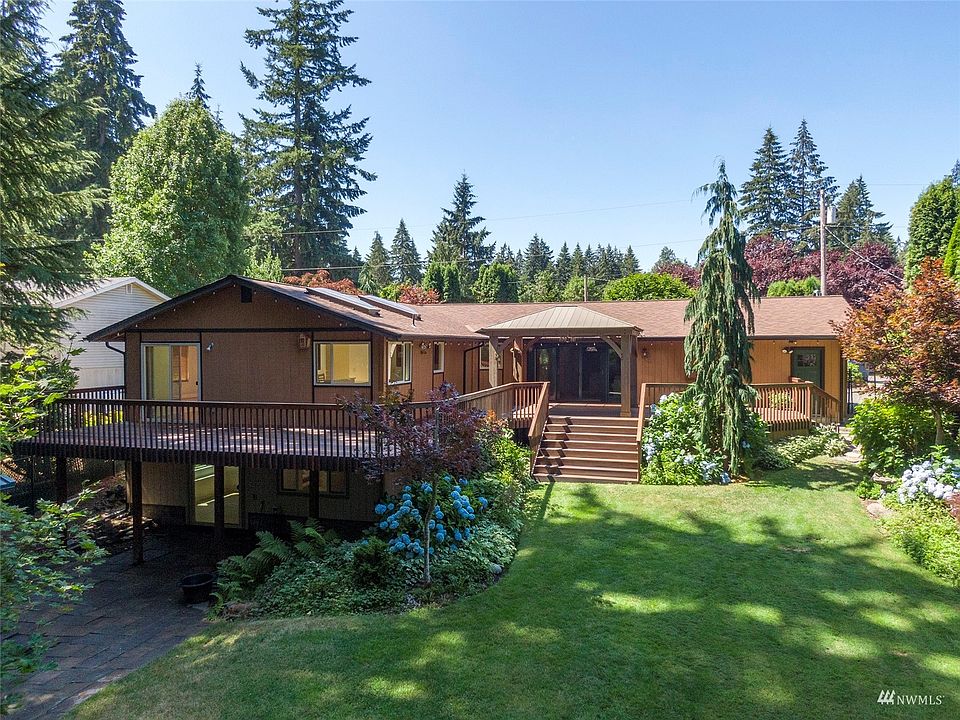 A must see 2,342sf updated rambler with a daylight basement in coveted Debra Jane Lake community. This original owner home had a huge addition in 1998 & more recently: roof & gutters (2021), windows, skylights, deck, gas fp, tiled baths, etc. It is one level living with 3 beds and 2.5 baths plus two bonus rooms down. A stunning 1,039sf wraparound deck is perfect for entertaining and relaxing. The 0.37 acre lot has vibrant landscaping, a wooded area, & is fully fenced. Don't miss the two sheds (12'x16' and 8'x10'). House is wired for a generator and all appliances stay. The house is walking distance to Allan Yorke Park with a boat launch at Lake Tapps. The community also has lake access, a pool, tennis courts, sports fields, and playground.