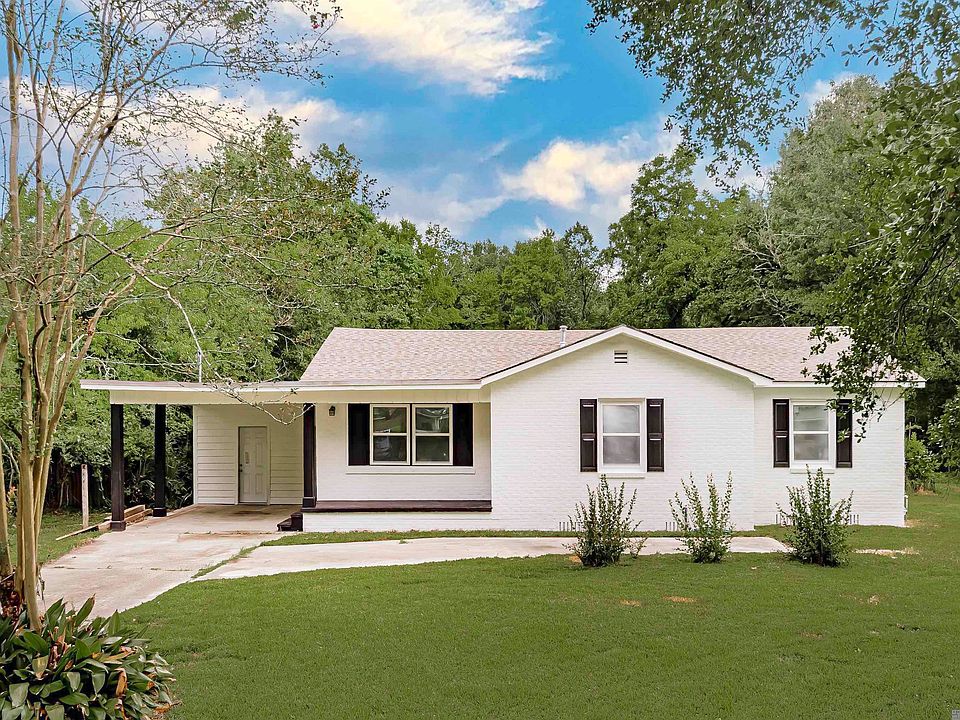 This beautifully renovated 3-bedroom, 2-bath home with an office or bonus room sits on nearly an acre in the peaceful Brownfields Subdivision. From the moment you arrive, the freshly painted black and white exterior and inviting front porch set the tone for the charm and character that continues throughout. Inside, the uniquely designed layout offers both comfort and flexibility, with a spacious, elongated living room that can accommodate a dining area, and a huge sunken den centered around a striking dark gray brick fireplace. There's also a new HVAC and hot water heater. The kitchen features brand new cabinets, a double-sided sink, granite countertops, a stylish gray backsplash, and a brand new stove. Luxury vinyl flooring flows throughout, while both bathrooms have been fully updated with ceramic tile floors, tile tub/shower combos and cultured marble vanities. Originally a one-bath home, a second bathroom was thoughtfully added to enhance functionality. New windows and updated lighting add a fresh, modern feel. The spacious backyard offers endless possibilities for entertaining or relaxation, and the attached carport includes extra storage. Located just minutes from the airport, schools, colleges, restaurants, and the interstate, this move-in-ready home offers comfort, convenience, and space—all in a quiet neighborhood setting. **the opening in the den will be sealed soon**