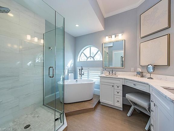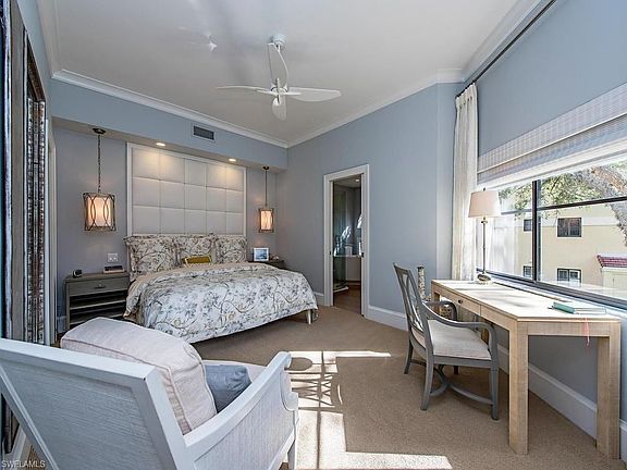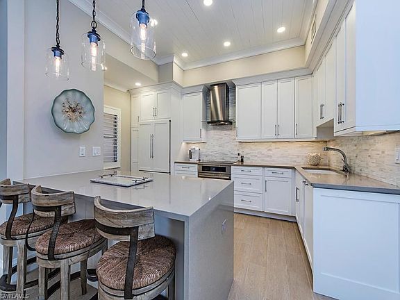 C.14211 - Completely remodeled professionally designed furnished home has a breezy soft beach décor featuring high-end finishes; wood tile, crown moldings, 8" baseboards, raised planked ceilings, LED recessed lighting, solid doors, all new hardware, fans & custom window treatments. White kitchen has been opened up w/quartz counters, glass tile backsplash, Jenn Air stainless steel & cabinet faced appliances, breakfast bar w/pendant lighting & adjacent dining area. Living rm features custom built entertainment cabinet & leads to a screened lanai w/impact glass sliding doors & transom windows overlooking garden courtyard area. Spacious Master suite w/built-in headboard, work area, walk-in closet w/built-in cabinets/shelves. Master & guest baths boast frameless glass showers w/marble tile, quartz counters, double sinks & a soaking tub in master. All new plumbing & wiring throughout! Private storage closet is just outside entry. Close to all amenities that Pelican Bay offers & an easy walk to the tram station!
