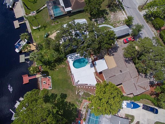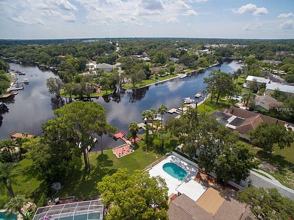 Fall in love with this charming 3 bedroom, 2 bath Pool home with open water views overlooking the Cotee River and access to the Gulf of Mexico. Entertain in the beautiful kitchen, decorated with intricate glass tile back-splash and featuring an island, tile flooring, wood cabinets with built in wine rack and plenty of counter space. This area overlooks the family room that includes a built in gas fireplace to gather to watch a favorite movie or catch up after a busy day. The sliding glass doors lead to a delightful screened lanai, and out to the 12 X 12 stone deck with fire pit. Escape to the outdoors and cool off with a dip in the pool and enjoy the sun out on the floating boat dock. Relax in the spacious master bedroom with stunning river views and walk in closet. Ample parking with a two car garage and a second golf cart garage/ work shop. This home is minutes away to the downtown New Port Richey, Sims Park, stores, schools. No deed restrictions.