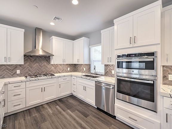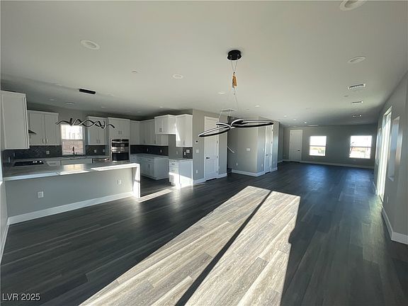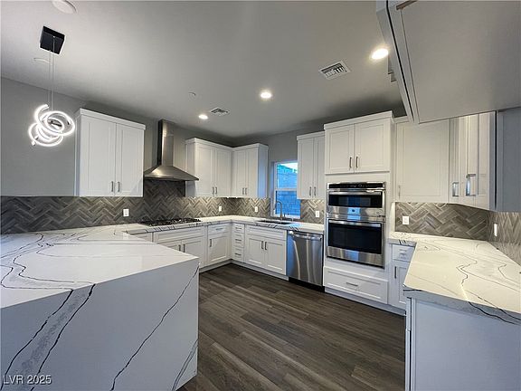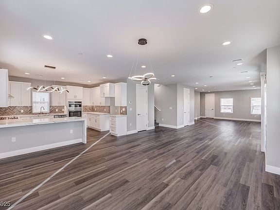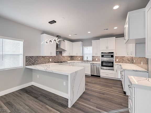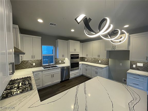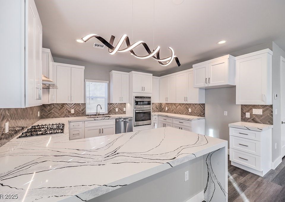 The home includes a two-car garage and a modern kitchen equipped with waterfall-edge quartz countertops, a custom backsplash, and upgraded lighting fixtures.