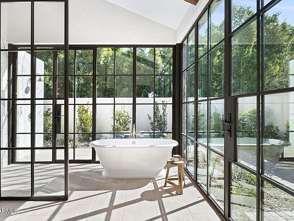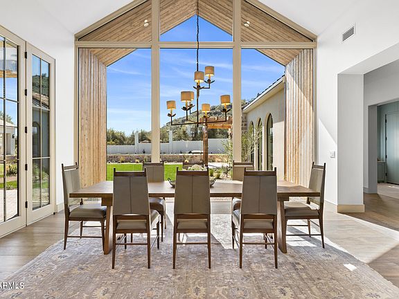 Eight bathrooms total, including a pool bath. Stunning oversized custom windows and doors throughout. Imported from France, the Great Room features an antique French limestone fireplace. Two additional oversized gas fireplaces are featured in the primary bedroom and outdoor covered patio space. Gorgeous custom white oak cabinets in a dark, rich stain paired with painted cabinetry throughout have been designed with high functionality in mind. European ILVE 7-burner gas range in the kitchen. Butler's pantry with custom cabinetry, appliance storage and nearby service entrance. Guest quarters include a private bathroom/bedroom, large walk-in closet and private garage access. Five-car garage. Custom pebble sheen pool, designated fire pit area, covered pool dining/fireplace space, with pool bath attached. Landscape design is an extension of the home's overall architecture and design. Two imported antique French limestone basins in front and back creates a soothing outdoor experience. A private fountain and patio space with access from the office, mature trees and lush landscaping create a true English Country feel here in the heart of the desert. Limestone and stucco exterior is balanced with a wood shingled roof, wood paneling elements and metal roof accents. Lantern-like exterior lighting adds charm and character. Primary bathroom features stunning mountain views and a private indoor/outdoor shower for a true spa-like experience. Temperature controlled custom wine storage display. Flex room includes a functional kitchenette with a beverage refrigerator. Custom laundry room cabinetry and storage. Mudroom/drop zone near garage entrance for convenience and tidy organization. A private side yard off the kids wing bedrooms and laundry room is perfect for a dog yard or kids play area. Every inch of this home is perfectly designed with countless custom elements and a design aesthetic carried from the outdoors in. Stunning in every way.