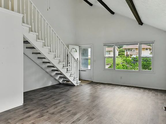 The living room welcomes you with high ceilings and exposed beams, while the bright eat-in kitchen offers plenty of storage and natural light. All three bedrooms are generously sized and include large closets, giving you the space you need.
