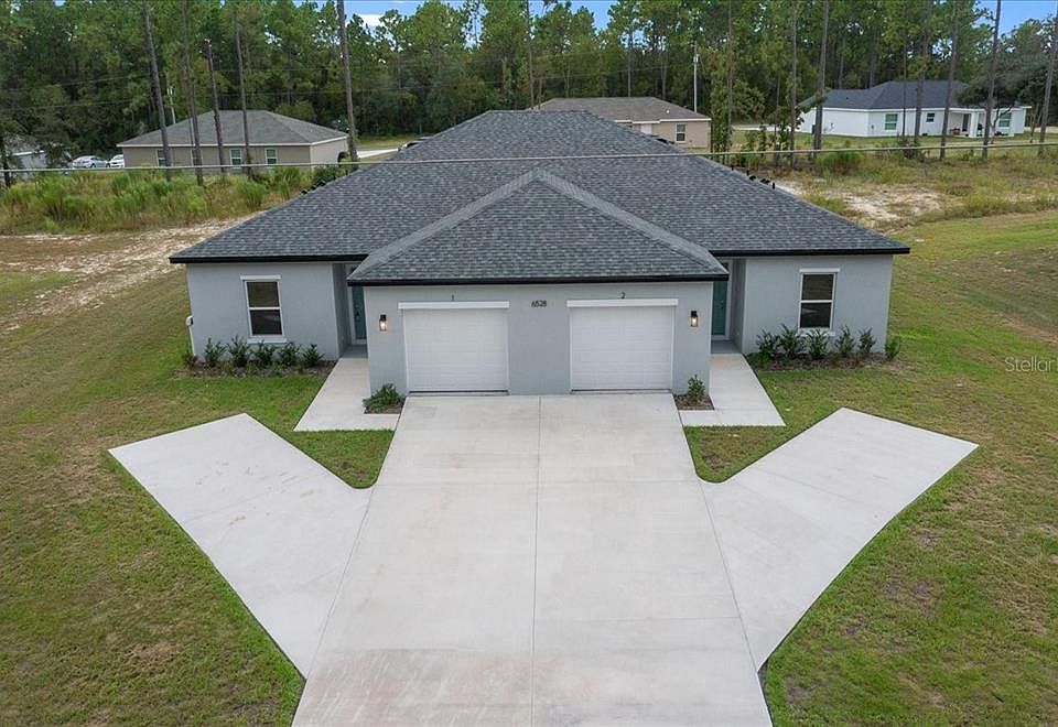This brand-new duplex is a fantastic opportunity for an investor to rent out both sides or for a buyer to live in one unit while leasing the other. Priced below recent appraised value, it offers instant equity and income potential. Each unit features a one-car garage and a covered lanai, along with beautiful touches like soaring ceilings, luxury vinyl plank flooring, and tile backsplashes that extend to the ceiling in each bath. The kitchens are designed for both style and function, complete with granite countertops, an island with a spacious eating area, and an open view into the living room that makes entertaining easy. With every detail thoughtfully designed with quality finishes, this property blends modern finishes with smart functionality and is ready to generate immediate value for its new owner. Three additional duplexes just like this one are also available in Marion Oaks, offering an unbeatable location close to I-75, shopping, and professional parks, making this a rare multi-property investment opportunity.