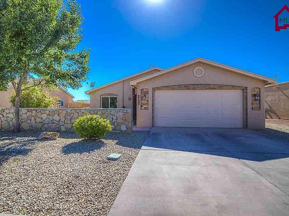 This home sits in a very quiet neighborhood on a cul-de-sac. It has an excellent open floor plan with stone accents inside and out. You are greeted by a charming brick paved East facing courtyard with views on the Organ Mountains. Tiled living room, dining room and kitchen. The living room has wood blinds, ceiling fan, pendant lights over the bar and decorative ledge. Bedrooms are carpeted with a ceiling fan in in the Master and large walk in closet. Master bath has a tiled walk in shower. Large back yard with plenty of room for entertaining, 2 car garage and plumbed for water softener. Hurry, this home won't last long!