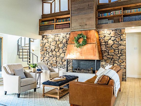 Grand stone fireplacePrivate enclosed patioLarge laundry roomDedicated home officeGranite countertopsExpansive rear windowsSerene tree-lined backyard