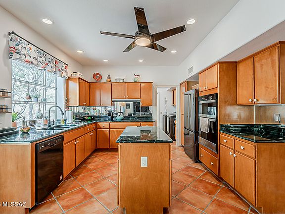 Tucked into a quiet cul-de-sac on an elevated lot, this beautiful Estancia model with its sought-after detached casita offers a rare blend of elegance, space, and serenity. Surrounded by open common areas & showcasing a prized north/south orientation, the home captures stunning views of the Catalina Mountains.Inside the main residence, you'll find soaring cathedral ceilings, built-in shelving, ceramic tile throughout (no carpet), classic shutters, a cozy gas fireplace, a versatile den, and a formal dining room with a wine cooler just steps away. The chef-inspired kitchen is both stylish and functional, featuring marble countertops, a generous island, high-end appliances, and a charming garden window overlooking the desert often visited by birds, deer & rabbits. The den can easily be converted into a second bedroom, creating a flexible 2-bed, 2-bath layout in the main home plus a fully equipped 1-bed, 1-bath casita across the courtyard. This setup is ideal for guests, multi-generational living, or a private workspace.