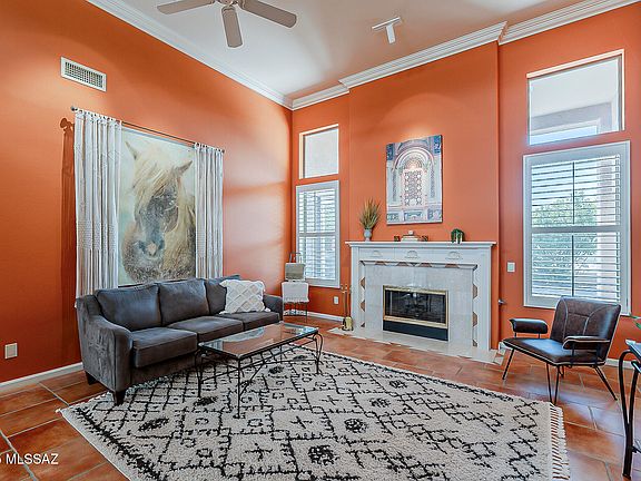 Nestled at the end of a quiet cul-de-sac on a premium elevated lot, this partially furnished Estancia model w/ the coveted private Casita offers a rare blend of elegance, space & serenity. Surrounded by open common areas and featuring a coveted north/south orientation, the home captures breathtaking views of the Catalina Mountains. Inside, you'll find cathedral ceilings, built-in shelving, ceramic tile throughout (no carpet), classic shutters, a cozy gas fireplace, a den, and a formal dining room with a wine cooler just steps away. The culinary-inspired kitchen is both stylish and functional, boasting marble countertops, a generous island, high-end appliances, and a garden window perfect for growing herbs while overlooking the natural desert--frequented by birds, deer, rabbits, and mo The detached casita across the courtyard includes a new mini split, sink, microwave, mini fridge, TV, and private full bath ideal for guests, a home office, or creative retreat.