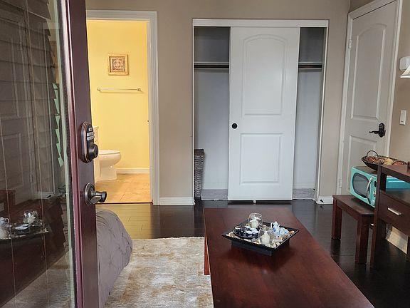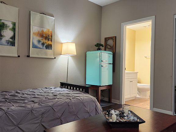 This private ensuite has its own bathroom, entrance, and porch, and it is fully furnished with a futon bed, coffee table, desk, mini refrigerator, and microwave. It is located on the 1st floor of the main house.
