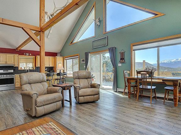 Location Location and beautiful mountain views. This lovely home on 1.4 acres is perched up perfectly to face the mountains with a private location toward the end of a cul-de-sac within the desirable neighborhood of Pinon Hills. Only three miles from historic downtown Salida, this home has been fully renovated to "move in condition". Vaulted ceilings, granite countertops, all new Maytag appliances, new flooring, remodeled kitchen and bathrooms, new cedar fencing, metal roof, new septic tank and a fresh coat of paint everywhere. The spacious kitchen boasts a large center island. This home has an open floor plan concept with plenty of windows to bring in the sunshine. The loft primary bedroom allows for great views, has plenty of space and a large attached full bath with double vanities. Great outdoor space to take in the views from the patio. Enjoy the quiet and stars at night from your new "Hot Springs" hot tub. The detached heated oversized 2 car garage includes a workshop space and plenty of cabinets for storage. The lot has plenty of space for an RV or camper with convenient clean out. Two private cedar fenced yard spaces. Close to fishing on the Arkansas river, hiking, biking, skiing and outdoor recreation. By appointment.