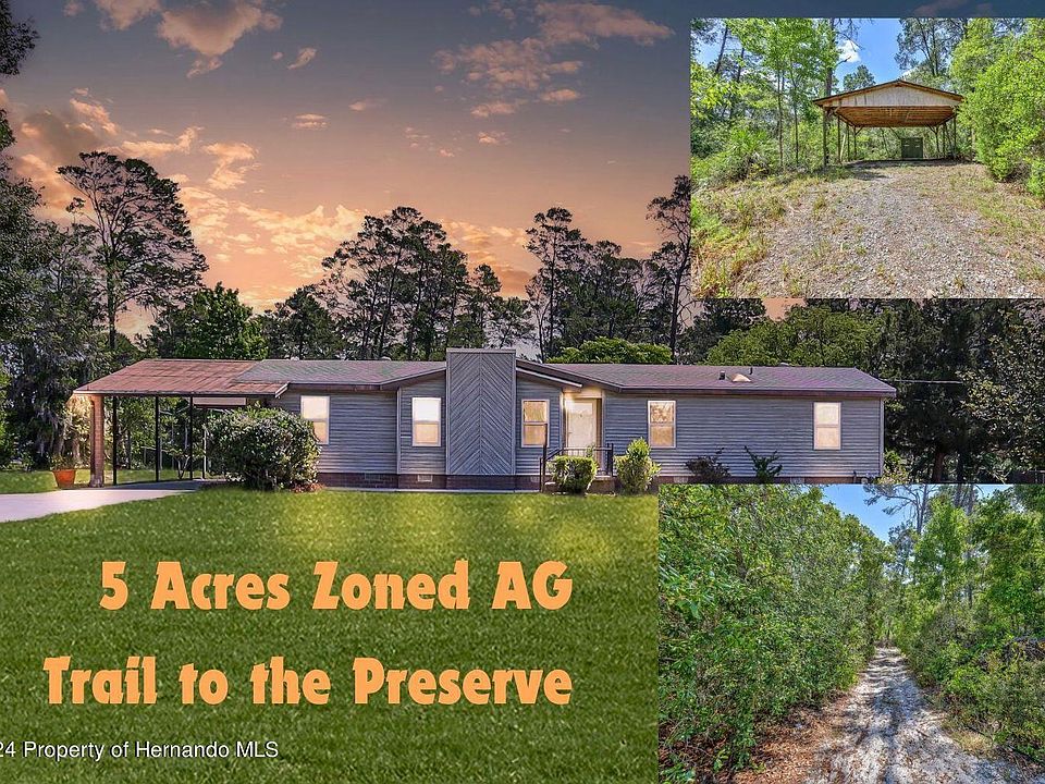 A LITTLE BIT COUNTRY... This Home is on Five (5) Acres (165 ft x 1319 ft) Zoned AG and Backs up to the Weeki Wachee Preserve ! Nature at Your Backyard.. PLUS is Close to the Weeki Wachee River & The Gulf of Mexico. Keep this Home or Build New.. Two Trails in your Backyard.. Pole Barn Plus a Storage Shed. The property is partially Fenced which is a Plus if you have Pets. Circular Driveway with this Manufactured 3/2 Home with 12 ft x 35 ft Carport that sits back off the road. Separate Front Living Room & Back Family Room with a Fireplace. Kitchen is Large with a Breakfast Bar & Built in Table & Bench. Dining Room is Right off the Kitchen and has a Built in Hutch. Washer and Dryer can convey which is located in the Laundry Area off of the Kitchen. Master Bedroom Suite offers a Walk in Closet, Dual Sinks, Walk in Tub & Separated Walk in Shower. Split Bedroom Plan for Privacy. Bedroom 2 + 3 share an Updated Bathroom with Walk in Shower. Florida Room off of the Family Room is 15 ft x 20 ft and is perfect for Family & Friend Gatherings. Come See !!