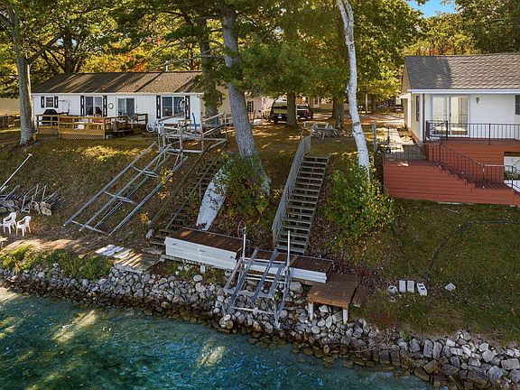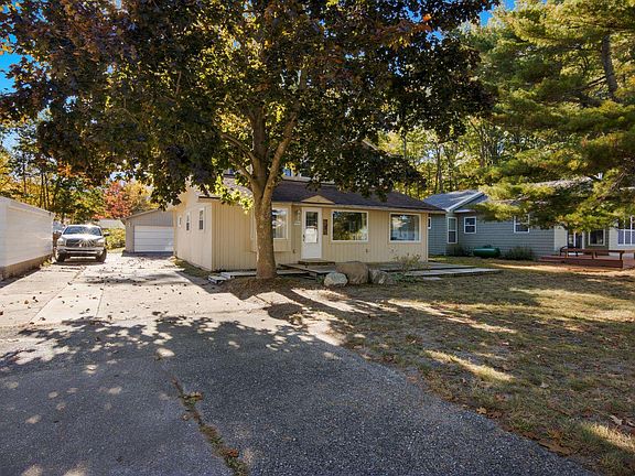 Access to Big Platte Lake comes with this year-round four-bedroom, two-bath home and a huge, detached garage with a workshop. Steps lead to your shared 25 feet of lake access across the street, on the southwest side of the lake. Wear your swimsuit and bring the kayaks, or add a dock to launch into all-sports fun. Completely remodeled in 2001, the two-story home has 2202 sq ft, with plenty of bedrooms for guests or use the space for crafts, hobbies, working out or reading. Everything sparkles and is in move-in condition with built-ins for your belongings. The dining room faces the lake, as does the kitchen sink, so prepare, clean up, and feast this holiday and still enjoy the view. Lengthy counters and plentiful cupboards give you the elbow room and storage you need, with additional cupboards in the hallway for your special dishware. Multiple windows add light to the large living area. The main level also includes a bedroom and full bath, a laundry room with a sink and cupboards, and a mudroom entry. Upstairs are three more bedrooms. The primary bedroom includes a private bath and a large, walk-in closet. A vaulted wood ceiling and bookcase in another room offer a cozy space for your private library. When you are in a social mood, gather on the front deck with friends and head to the back patio. A 48x24 garage has lots of room for vehicles and toys, and the enclosed workshop gives you space to create, tinker and fix. Big Platte Lake is known for swimming, fishing, sailing and boating. Paddle from here to Lake Michigan.