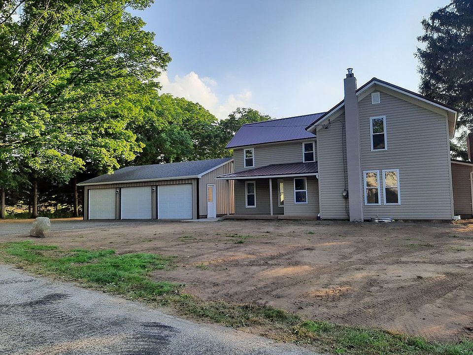 1500 sq ft. living area house with unfinished basement on 1.16 acres, 3 car garage, 3 bedrooms with 2 full baths, living room, dining room, kitchen. Has new windows, new doors, new siding, new septic system and only a 3 year old metal roof on the house.