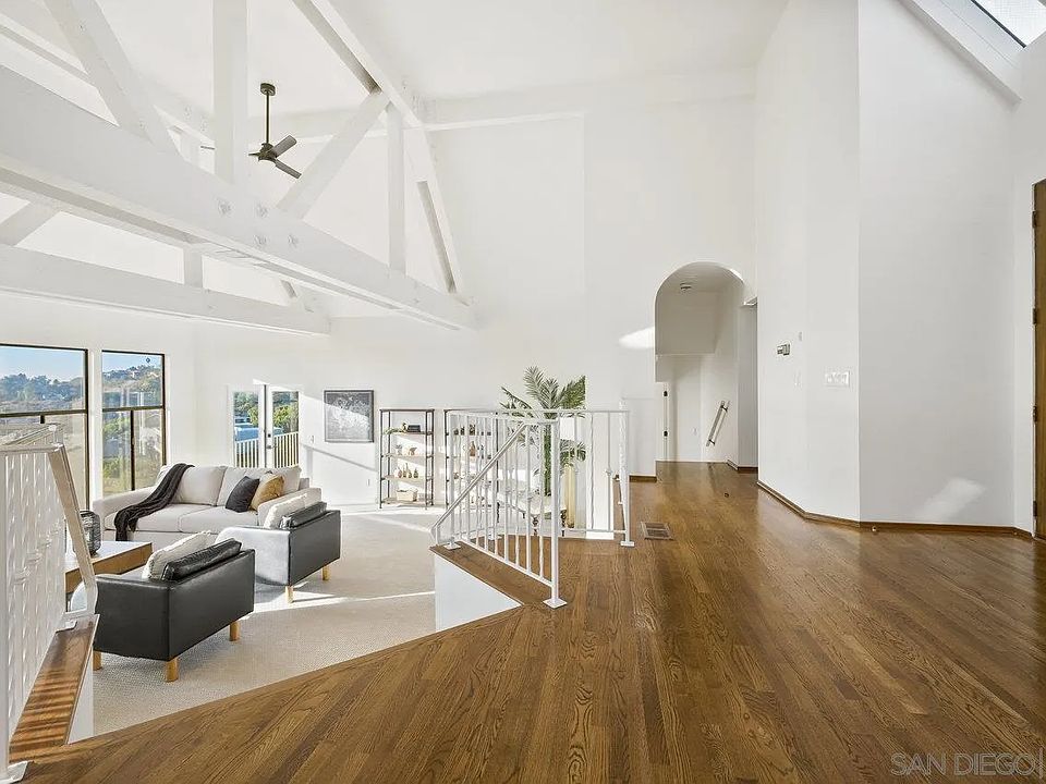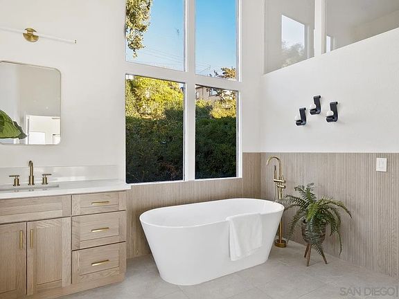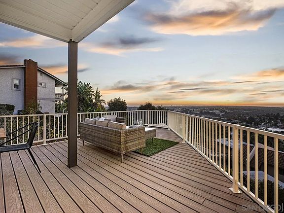This newly renovated home offers unparalleled luxury and breathtaking panoramic views of the Coronado Bridge, Downtown, and the surrounding mountains. With 4 spacious bedrooms and 3.5 elegant bathrooms, it’s designed for both family living and entertaining. The home features a formal sunken living room with a marbled gas fireplace, a charming garden window breakfast nook, and a large view deck. The dual living family room is complemented by an indoor spa, offering a perfect space for relaxation and fun. The primary retreat is a private sanctuary, complete with its own viewing deck, a luxurious oversized stand-up shower with dual shower heads, a freestanding soaking tub, and a walk-in closet. The gourmet kitchen is a chef’s dream, with a Sub-Zero fridge, golden marbled quartz countertops, and slow close white shaker cabinets paired with brushed bronze hardware. Additional highlights include vaulted ceilings with exposed beams, a 3-car garage, and incredible views from nearly every room in the house, at dusk the views are unmatched. A quick 5 minute drive to Kumeyaay Lake and freeway access. This home truly combines style, comfort, and functionality in a prime location.