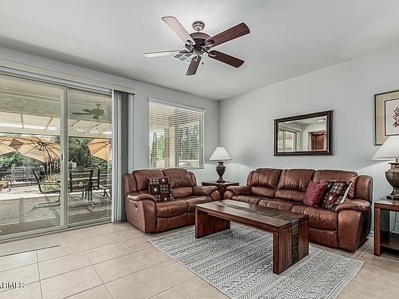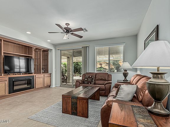 Beautiful 'Inspiration' model in Sun City Anthem at Merrill Ranch boasts luxury living in a 55+ golf community with ample amenities to suit the active life style. This open-concept floor plan offers 1,495 square feet, a private primary bedroom suite with bay windows, a 2nd bedroom for guests, separate study/den, eat-in kitchen, and two baths. The living room area showcases a custom built-in wall unit with an electric fireplace-- perfect for cozy mornings in cooler months. Additional features include a 2-car garage with ample storage, a water softener, and a RO water treatment system. Step outside to a truly exceptional outdoor entertainment area. Enjoy a covered patio and extended pergola with sun shades, BBQ, a gas fire pit surrounded by circular seating, and a tranquil waterfall feature Mature landscaping creates a serene, private backyard oasisyour perfect retreat!