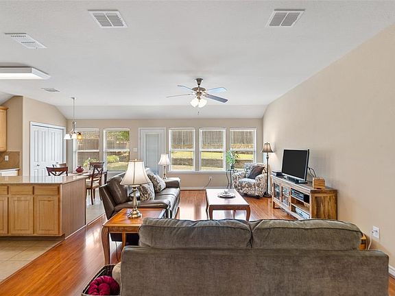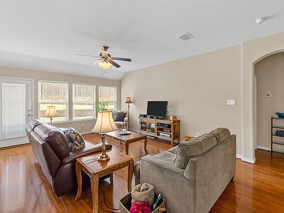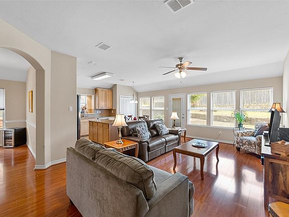 Meticulously cared for home with an open floor plan has a combined living, formal dining, art niches, double-hung windows, and stunning wood-like flooring. Spacious kitchen with electric range, built-in microwave, stainless steel sink, island, 42-inch cabinets, ceramic tile backsplash, and plant ledge. The master suite has room for seating, a dual sink vanity, a garden tub, a separate shower, and walk-in closet. Mud area in the laundry room. Grand tiered backyard with open patio. Enjoy walking, hiking, and biking at nearby Fox Hollow Park and Cedar Hill State Park.