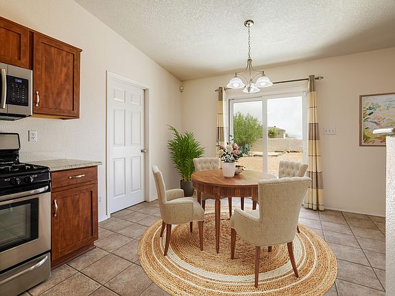 Discover this beautifully maintained 3 bedroom, 2 bath home nestled in the desirable Enchanted Hills Subdivision. Enjoy stunning views of the Sandia Mountains from your back yard in this thoughtfully designed, open concept home. The updated kitchen features stainless steel appliances, granite countertops and flows seamlessly into the living and dining area. Great for entertaining.This home offers both style and easy maintenance. The striking blue metal roof adds curb appeal, while the xeriscaped yard ensures low water usage and minimal upkeep. Additional highlights include RV parking, a dedicated charging station, and ample outdoor space for New Mexico's natural beauty. Don't miss this move in ready gem!Virtual Staging Used.