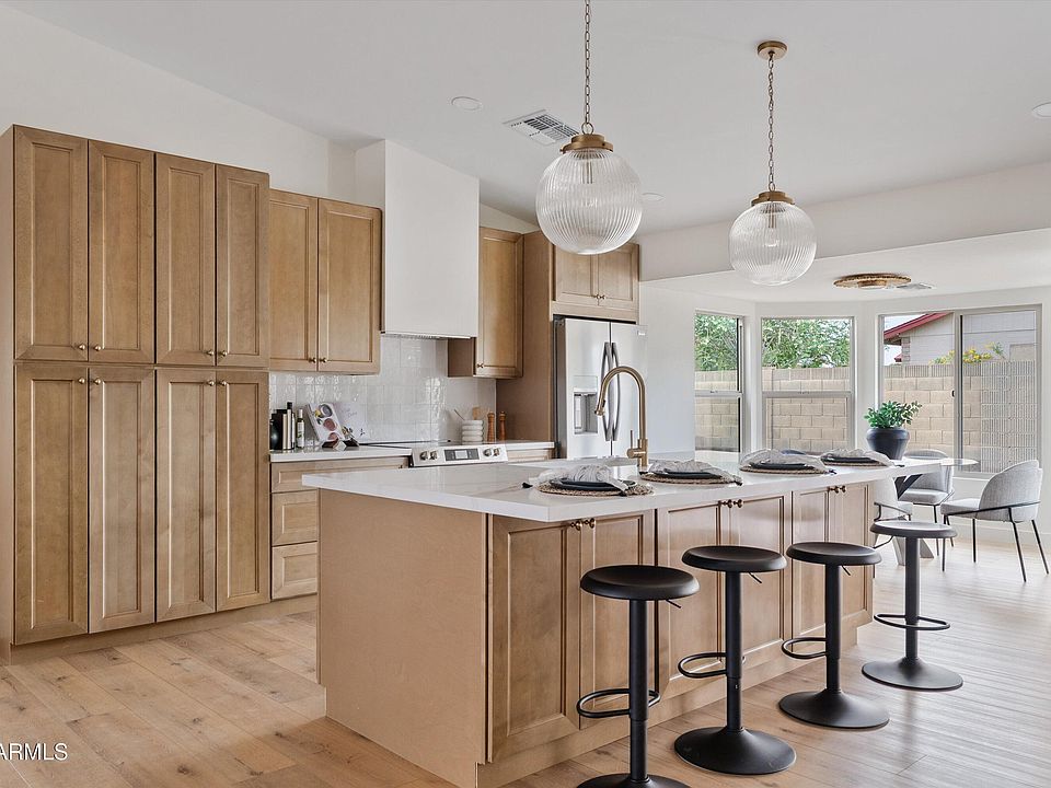 Welcome to this stunning remodeled Tempe home situated on a spacious corner lot! This home features nearly 2,000 sq ft of stylishly updated living space w/ designer finishes throughout. The interior showcases custom cabinetry, new wood-look LVP flooring, & elegant fixtures that elevate every room. The beautiful kitchen is complete w/ an oversized eat-in island, cozy dining nook, new appliances, & ample cabinetry offering exceptional storage.