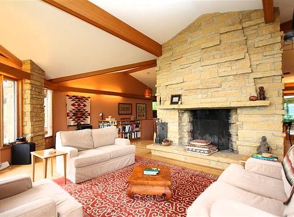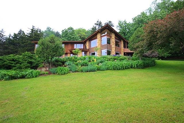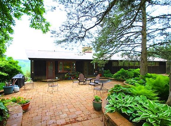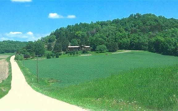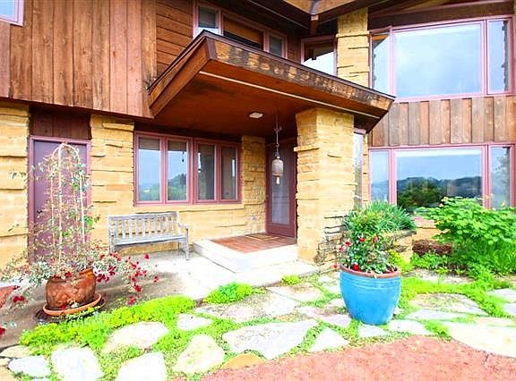 Amazing Frank Lloyd Wright inspired home perched on 20 acre hilltop! Designed by Wm Kaeser with stone columns and windows that frame the bluffs! 4 bdrms, 3 baths (remodeled w/tiled showers & jetted tub) plus 2 floor to ceiling lannon stone fireplaces. Gourmet kitchen, spacious great rm + finished family rm. New spacious patio and sep. bldg (25x45) fully insulated w/electric and heat & 11' door. 2 gardens, fruit trees and landscaping that flowers year round! 15 acres currently rented or-opt for animals