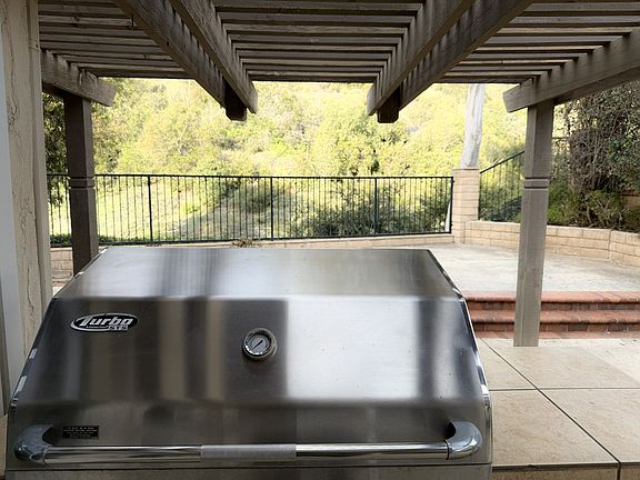 The private backyard features a built-in BBQ, seating area, and scenic canyon views ideal for relaxing or entertaining.