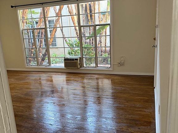 Large HOLLYWOOD STUDIO! Fabulous property. Close to Everything that MAKES HOLLYWOOD SO UNIQUE. This BIG, BRIGHT FIRST FLOOR STUDIO Apartment provides you with a massive Floor-to-Ceiling Window that overlooks a serene and peaceful LUSH & TROPICAL COURTYARD. HIGH CEILINGS, Great Hardwood Floors, AIR CONDITIONING, VERTICAL BLINDS, North/South exposure. THE KITCHEN IS HUGE. It has room for a BREAKFAST TABLE and CHAIRS. Double Kitchen Sink. PLENTY of CABINETS. Beautiful bathroom. , a separate TUB and SHOWER. There's a SEPARATE PRIVATE DRESSING & VANITY area adjacent to the BATHROOM. You also get BUILT-IN Chest of Drawers, and a Big Closet with Storage. TWO STACKABLE WASHER/DRYERS are in the on-site LAUNDRY. Won't last long. Street Parking by permit Owner pays water