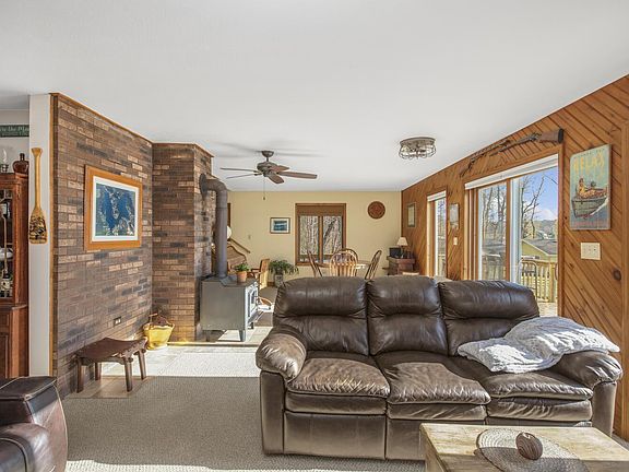 This three-bedroom, two-bath, 2,400-square-foot home overlooks all-sports Shavehead Lake from a terraced .29-acre lot with 90 feet of waterfront on a quiet dead-end road amid woods, fields, wildlife, waterfalls and spectacular sunrises. A bunkhouse with electricity, knotty-pine walls and ceiling, and bunks stands by the waterside with a firepit, stone seawall, shallow, sandy entrance, and dock. The main level includes an open living area with knotty pine and brick accents, a brick woodstove, access to a wraparound upper deck, and panoramic lake views; a dining area; a kitchen with stainless appliances and exterior access; a bedroom; and a bath. Upstairs are two bedrooms and a bath. Downstairs are a laundry and utility room with toilet, a storage area with garage door, and a sitting area with access to a covered patio. Some furniture, including a kitchen china cabinet and bedroom suites, is included.