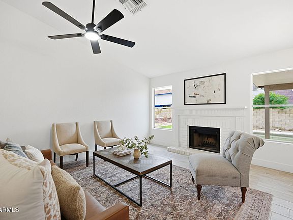 Step into this refreshed 3 bed, 2 bath home featuring new exterior & interior paint & wood-look tile flooring that flows seamlessly through the main living areas. The bright & inviting great room is highlighted by large windows that fill the space w/ natural light, all centered around a cozy fireplace. The updated kitchen boasts refinished cabinetry, a chic tiled backsplash, quartz countertops, stainless steel appliances & a convenient breakfast bar. All bedrooms offer new carpet. The primary suite includes a refinished tub/shower surround, a refinished vanity topped w/ quartz & a walk-in closet. Step outside to a backyard designed for both fun & relaxation, featuring a play pool & a large grassy area! Plus a NEW Water Heater!!