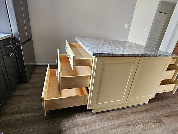 - Combination Kitchen/Dining, Combination Dining/Living, Dining Area, Entry Level Bedroom, Open Floorplan, Kitchen - Country, Kitchen Island, Recessed Lighting, Upgraded Countertops, Dry Wall
