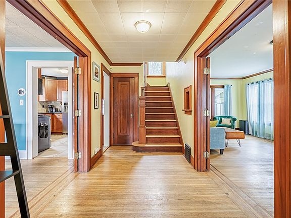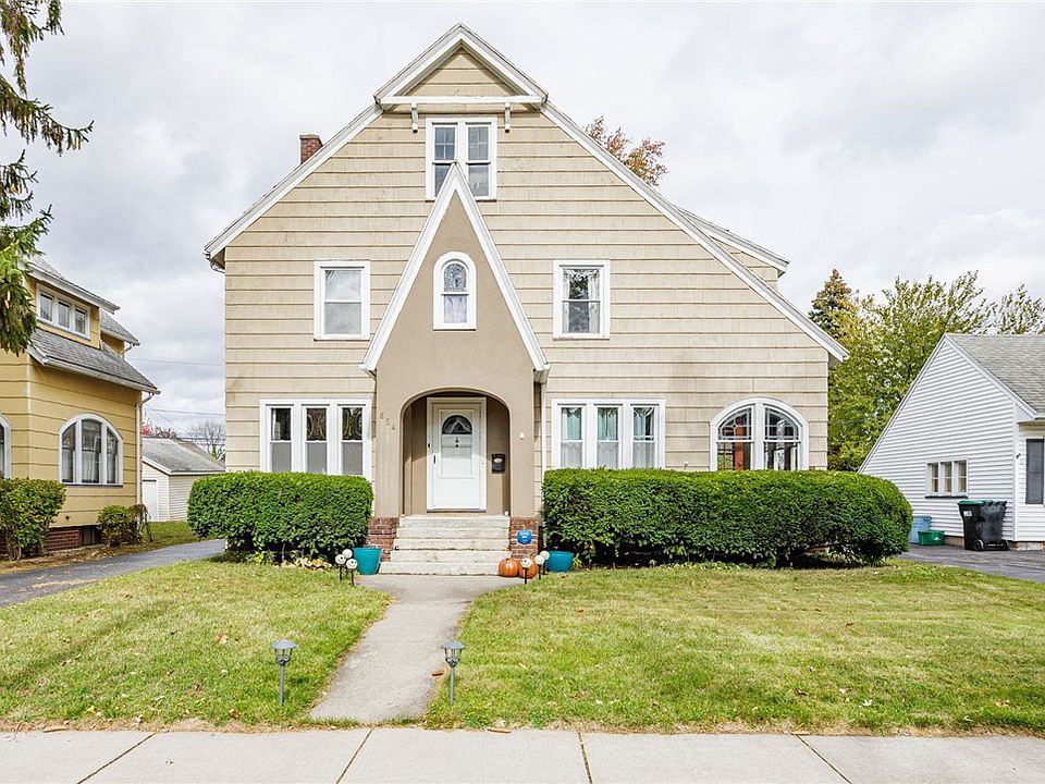 This classic 4-bedroom Colonial offers strong curb appeal and a well-balanced mix of original character and thoughtful updates. The covered front porch with arched entry and stucco exterior leads to a ceramic tile foyer and center hall layout. Hardwood floors with inlay detail, beautiful gum wood trim, and leaded glass accents highlight the quality craftsmanship found throughout. The spacious living room features a decorative fireplace flanked by built-in bookcases with leaded glass doors and a large mantle to decorate. An adjoining room with arched windows provides an ideal office or den. A formal dining room with French doors connects to the updated kitchen, which includes cherry cabinets, granite counters, tile backsplash, ceramic flooring, and modern stainless-steel appliances. A bright breakfast area and updated half bath complete the first floor. Upstairs offers four bedrooms, including a large primary with walk-in closet. The full ceramic tile bath retains its period charm with a pedestal sink and charming leaded glass window. The enclosed rear porch overlooks a fully fenced backyard, great for play or outdoor enjoyment. Additional features include vinyl replacement windows throughout. Check out this great property and you might just fall in love at first glance. Delayed negotiations: offers due Wednesday, 10/29 at noon.
