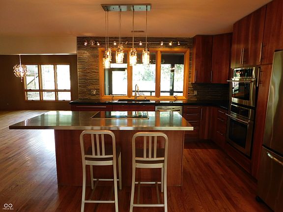 Rocky Ripple gem on the river! 4 Beds and 3 full Baths! This tastefully updated home features open concept living with a sitting room, kitchen, living room and dining room, lots of areas to spread out and perfect for entertaining! Kitchen features custom cherry cabinets, custom cement countertop and induction cooktop! Large screened in porch with French doors opens up off the dining room! Primary bedroom suite on the main level with French doors that open to the peaceful backyard with a hot tub hookup! The 2nd bedroom on the main level can be used as an office. The upper-level features 2 bedrooms, a full bath, and an enormous family room with awesome river views! The home sits on 2 1/2 lots and has multiple gardens! The hoop greenhouse is negotiable!