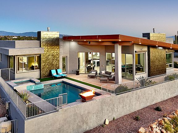Sleek, sophisticated & effortlessly modern, this custom home by Al LeCocq offers a rare elevated perspective of Tucson's natural beauty. Walls of glass frame sweeping mountain & sunset views, blurring the line between indoors & out. Open concept greatroom centers on a striking FP & flows seamlessly into a chef's kitchen w/waterfall island, gas cooktop & generous pantry. Resort-like outdoor spaces invite relaxation & entertaining w/sparkling pool & spa with fire feature, expansive covered patio, outdoor kitchen, ramada & putting green. Primary suite is a calm retreat w/ sitting area, FP, spa-like bath incl steam shower, lg walk-in closet & private laundry. 3 addl ensuite bedrooms offer privacy for family & guests. Refined desert elegance & modern design at its best. Owned solar.