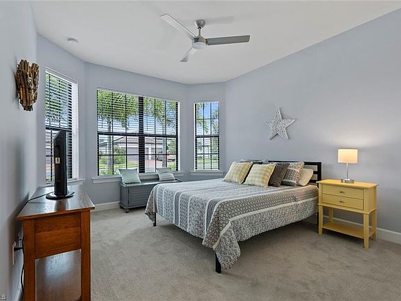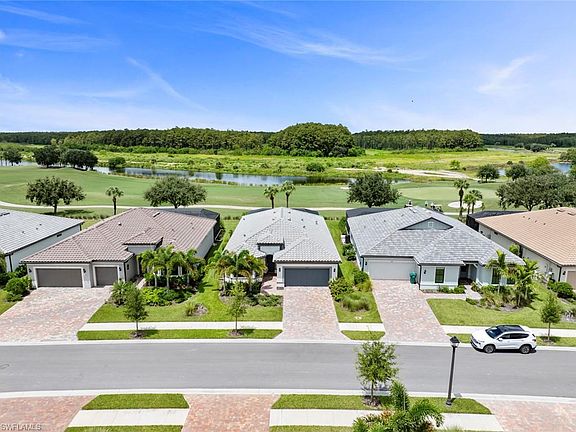 Nestled within the charming master-planned community of Ave Maria lies Del Webb Naples, an active adult enclave along with an 18 Hole Championship Golf Course at Panther Run. Here, amidst lush surroundings, residents enjoy a vibrant lifestyle tailored to their preferences. The Mystique Model Home is 1889 sq ft under air and is beautifully positioned on the 14th fairway with a lake view and a gorgeous saltwater screened-in pool with spa overlooking a breathtaking W view. The sunsets are spectacular! This move in ready home is 2 bedroom plus den, 2 bathroom, 2 car garage with tandem parking on one side for third car or extra storage space (15x10) featuring an open concept with zero corner sliders off the gathering room with door and window exit alarms leading to a spacious L-shaped extended covered lanai which includes an outdoor kitchen with 4 burners and rotisserie and fridge to entertain friends and family. This home has a tray ceiling in the gathering room, lush carpeting in both bedrooms and beautiful tile throughout the home and a laundry room with utility sink and Whirlpool front loading washer/dryer. There's also a sonos sound system in the living room. The expansive owner's suite boasts a walk in shower, providing a tranquil retreat within the comfort of your home. As part of the age 55+ Del Webb Community, residents benefit from gated streets, wonderful neighbors and fully equipped clubhouse which includes; resort pool, lap pool, jacuzzi, fitness center, 12 pickleball courts, tennis courts, bocce courts, golf simulator, billiards room, card rooms,dry and wet saunas, hair salon and extensive daily activities. While Golf membership is optional, the opportunity to engage in active living is ever present. This home does not include a golf membership or golf cart.